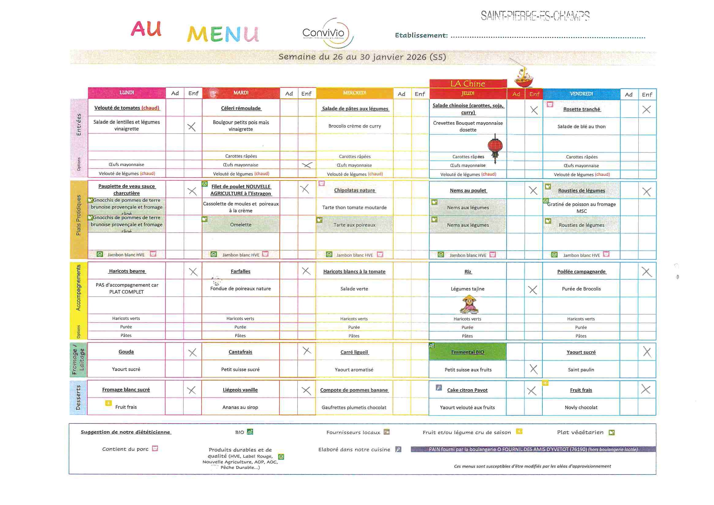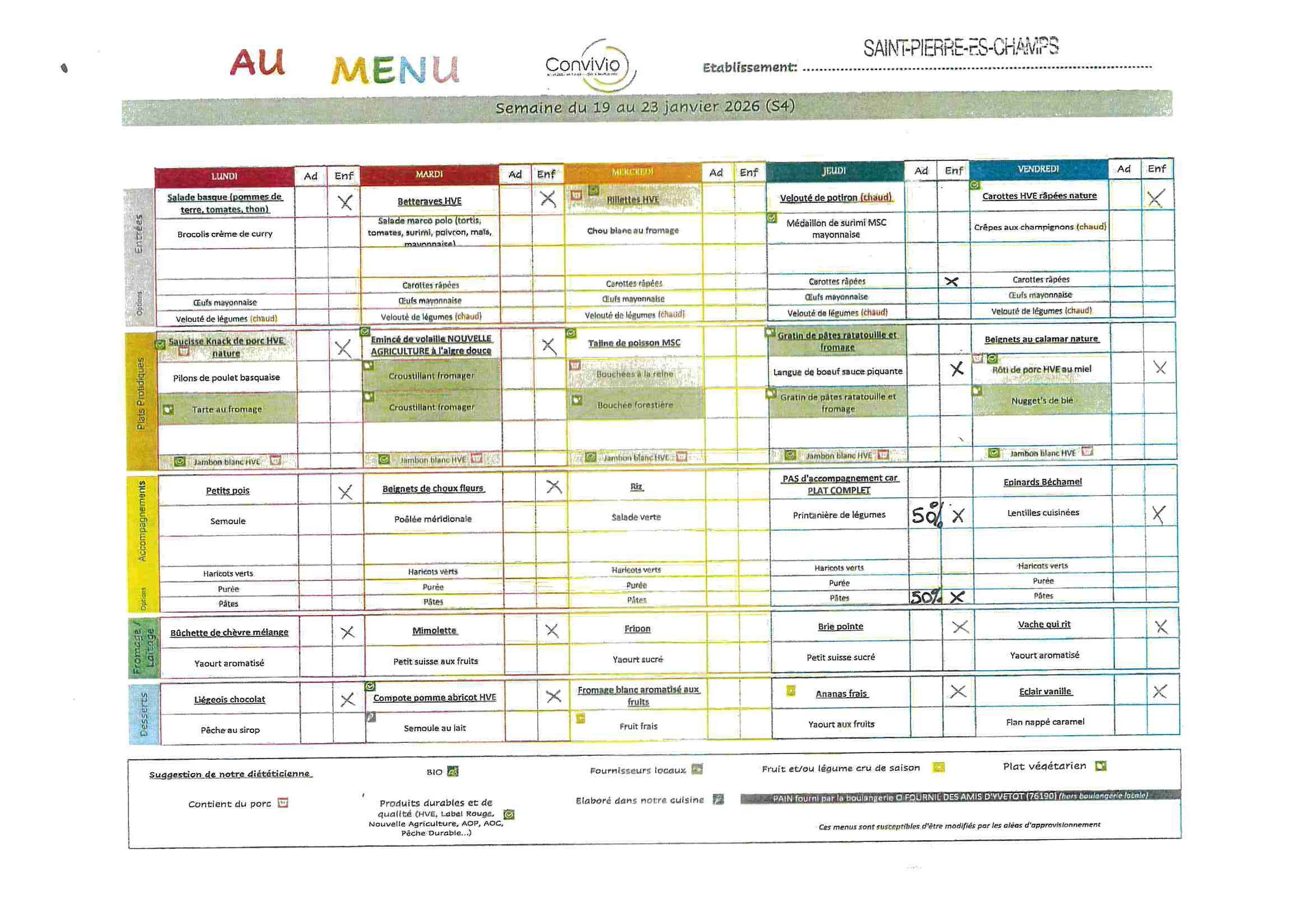 Découvrez le nouveau menu de la semaine de l'école Octave Pellerin de Saint-Pierre-Ès-Champs. Mise en ligne le : jeudi 22 janvier 2026
