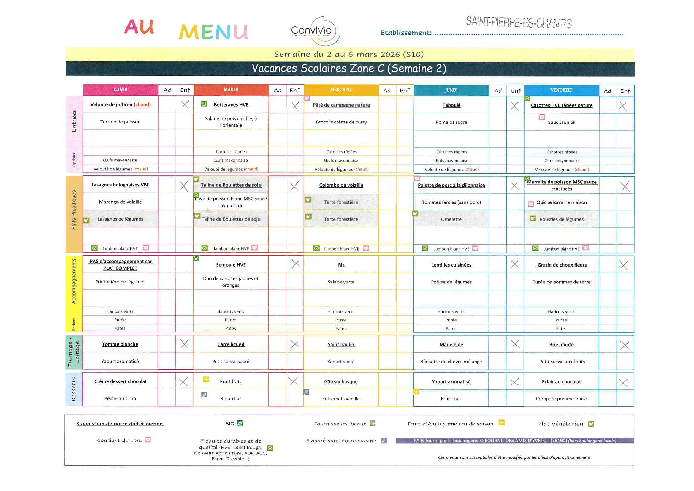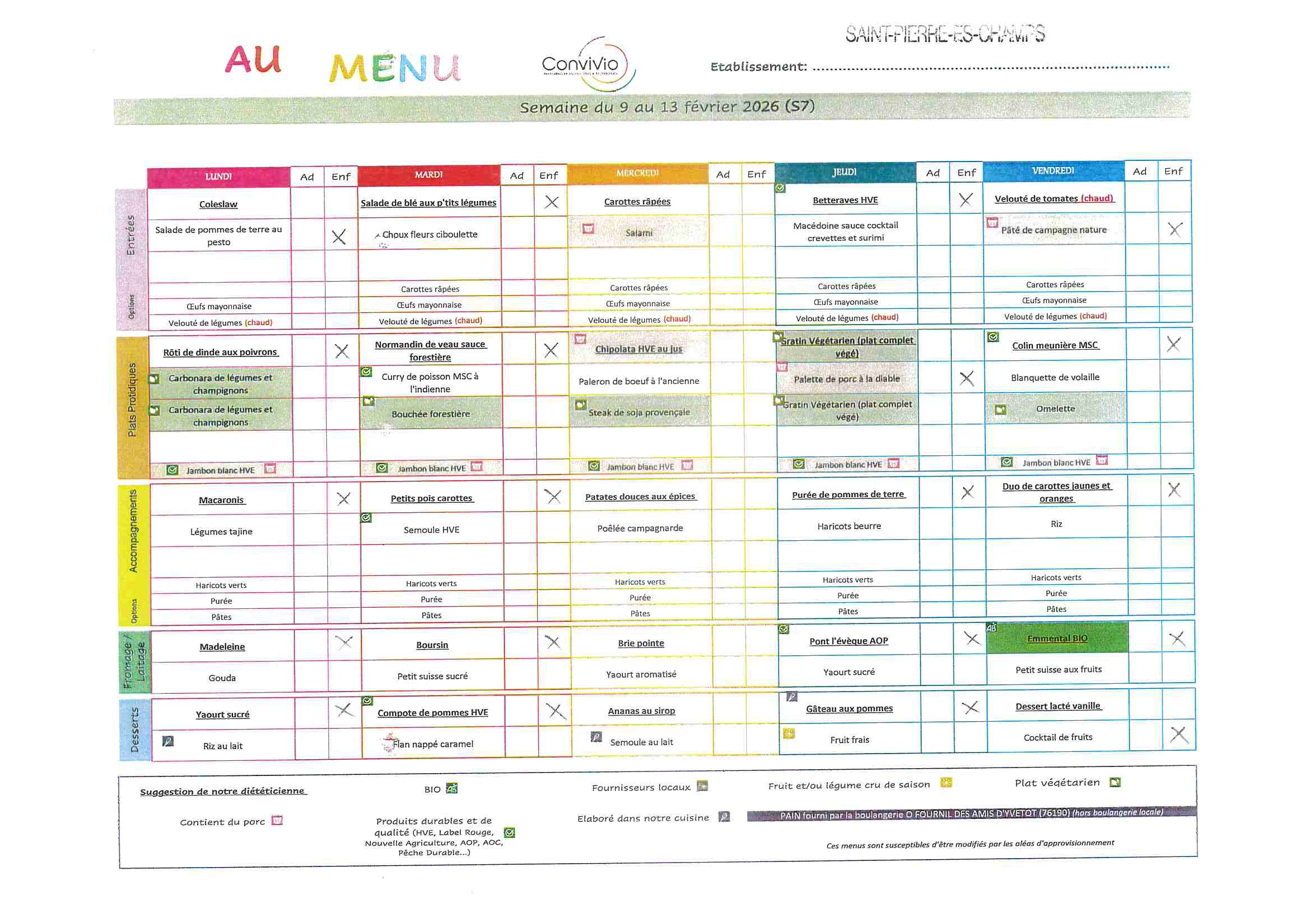 Retrouvez chaque semaine le menu de la cantine scolaire de Saint-Pierre-Ès-Champs.
