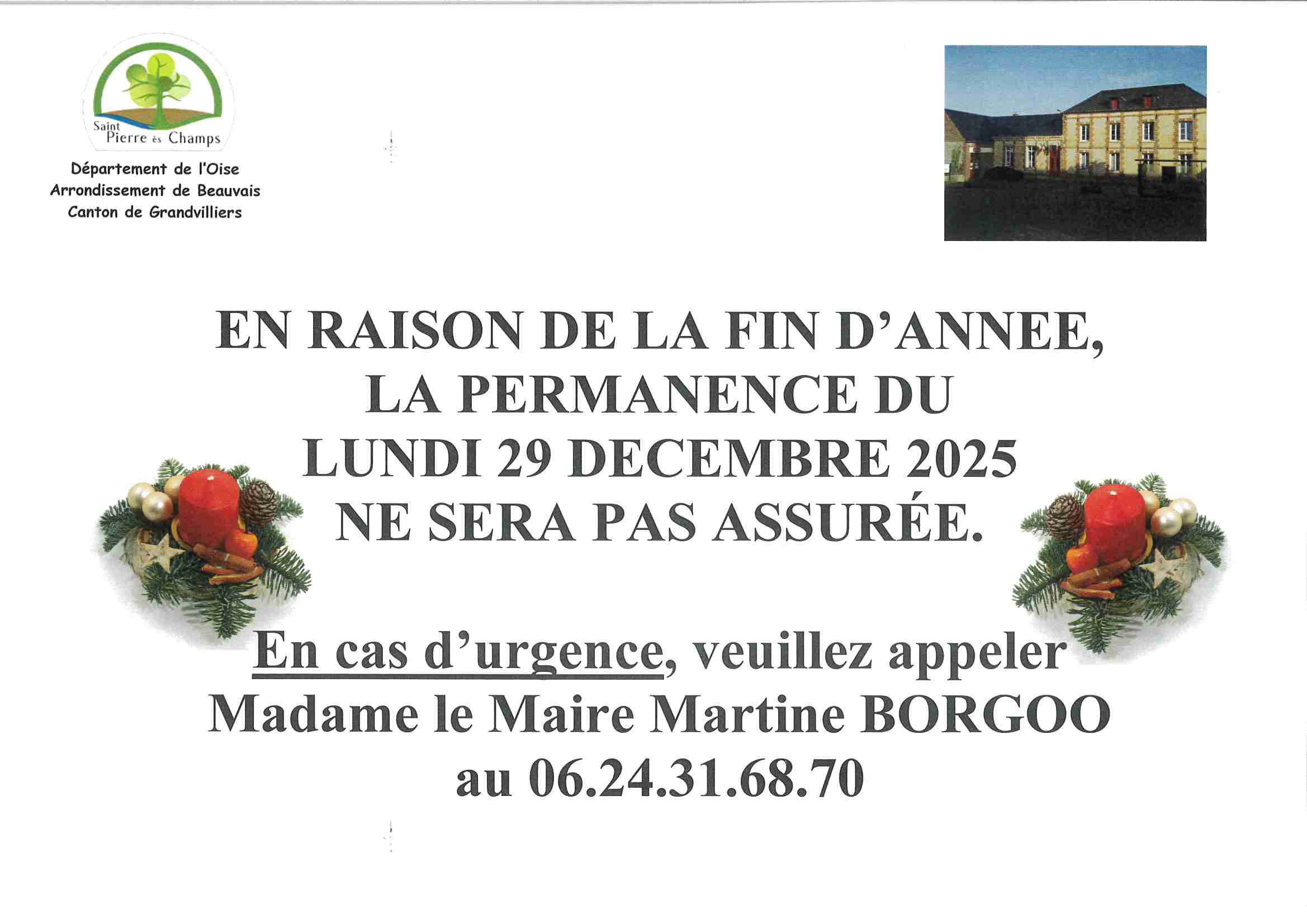 Nous vous informons que la permanence du 29 décembre 2025 de la mairie ne sera pas assurée.Nous vous remercions de votre compréhension.