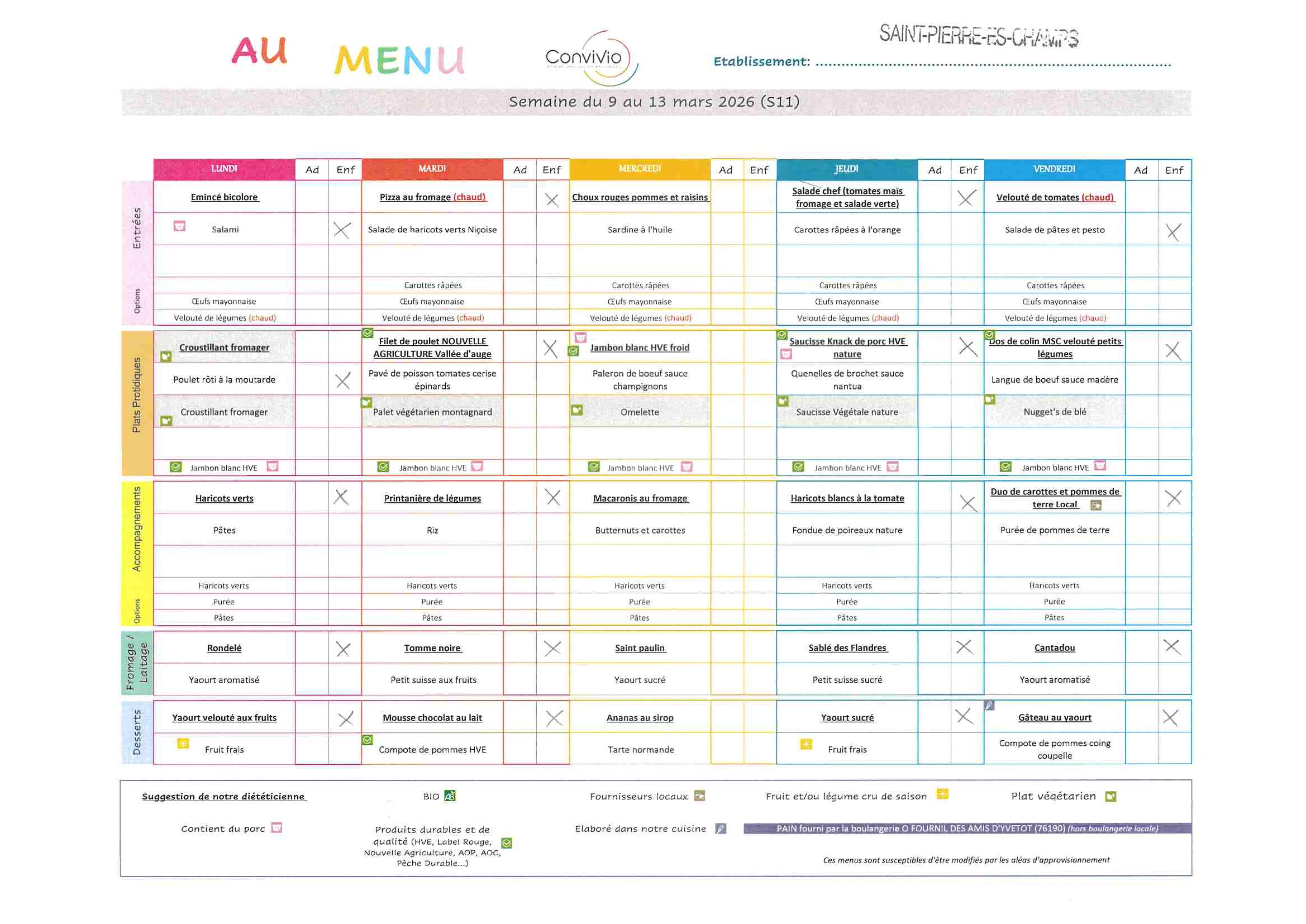 Retrouvez chaque semaine le menu de la cantine scolaire de Saint-Pierre-Ès-Champs.